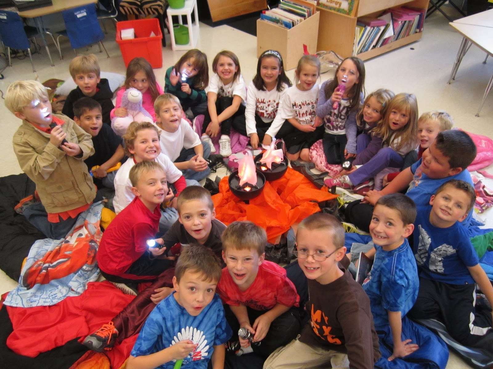 | My incredible janitor allowed us to use these fire pits. They ran much like a fan. I just added a little tissue paper around it to make it look spooky! |