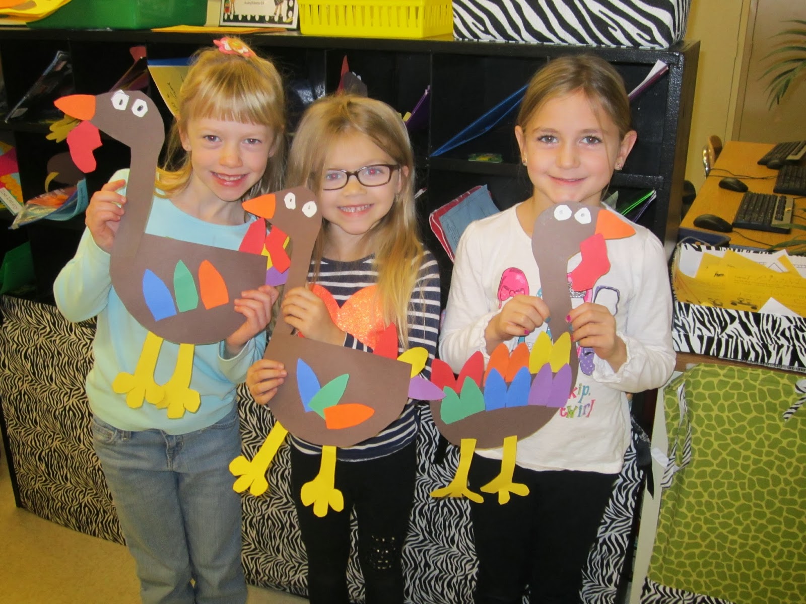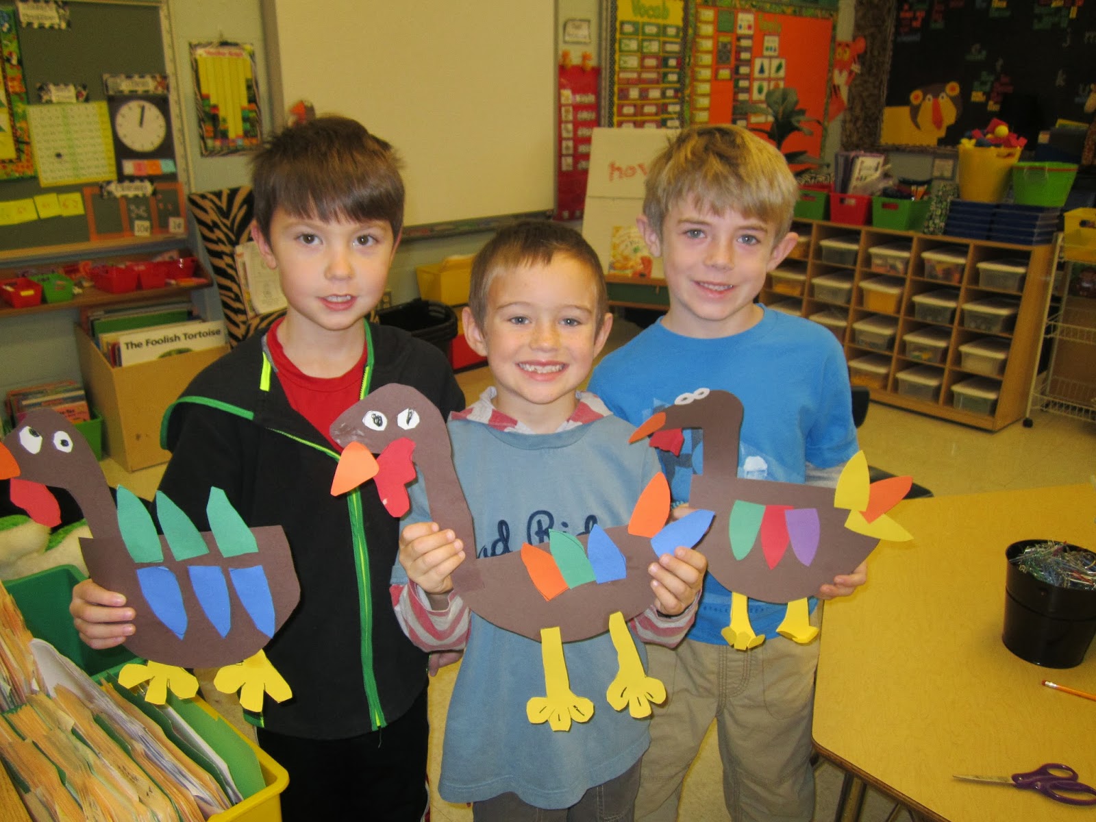 We made our turkey crafts today. Instead of using the coffee filters, I let the children cut out different colored feathers. They turned out adorable. I love how they are all different!